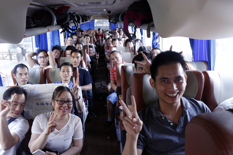 旅游途中大家意氣高昂,笑聲,掌聲在車內(nèi)縈繞不斷
