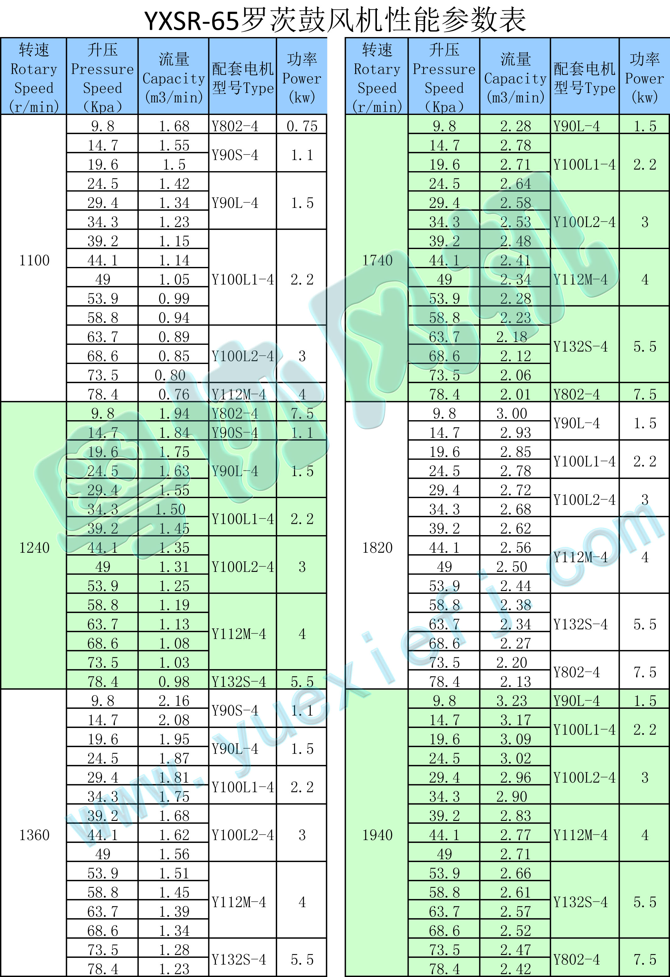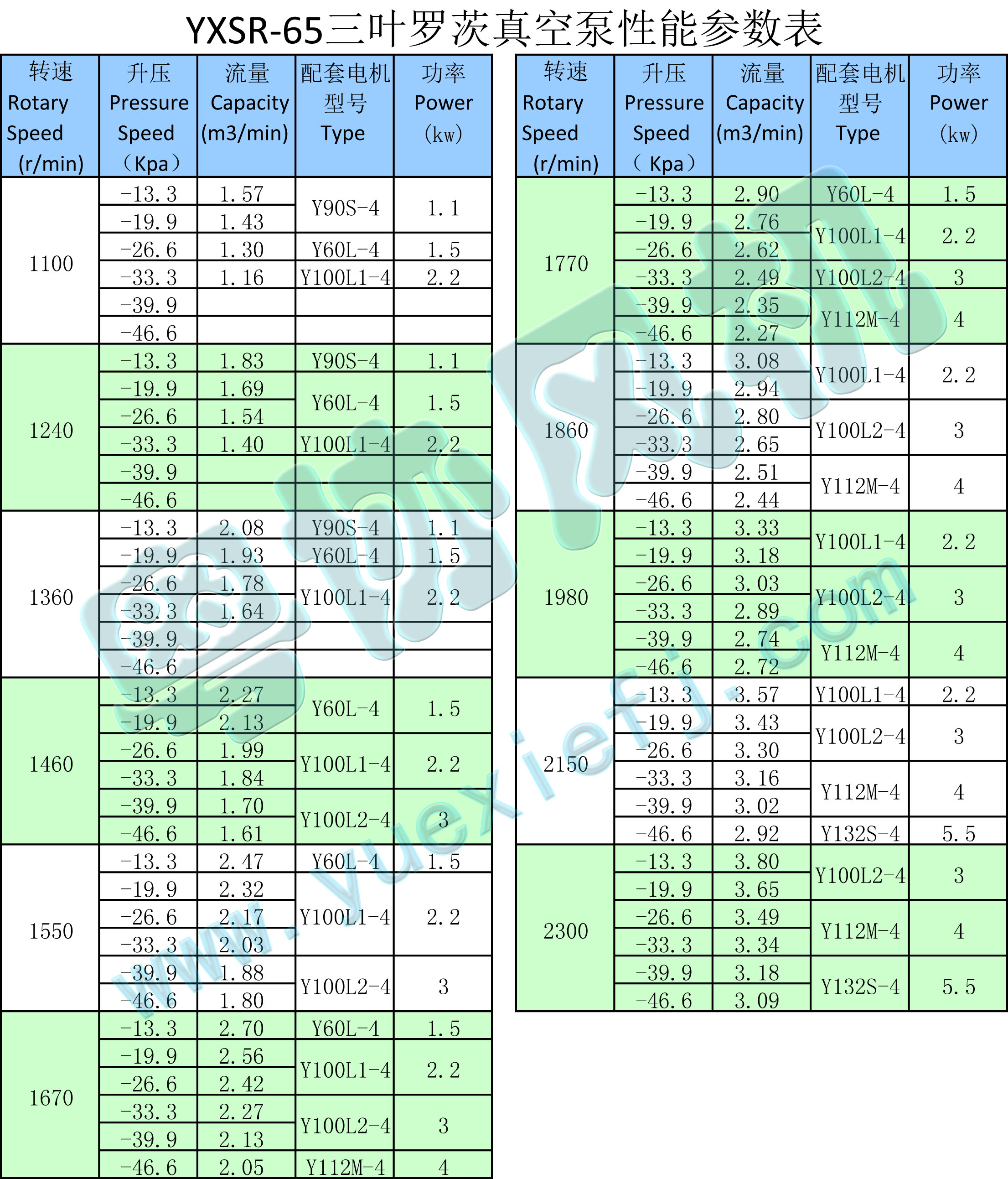 - 產(chǎn)品簡介:三葉羅茨鼓風(fēng)機(jī)有鼓氣和吸氣兩款,YXSR-65系列的三葉羅茨鼓風(fēng)機(jī)的流量范圍在0.76~3.23m3/min之間。