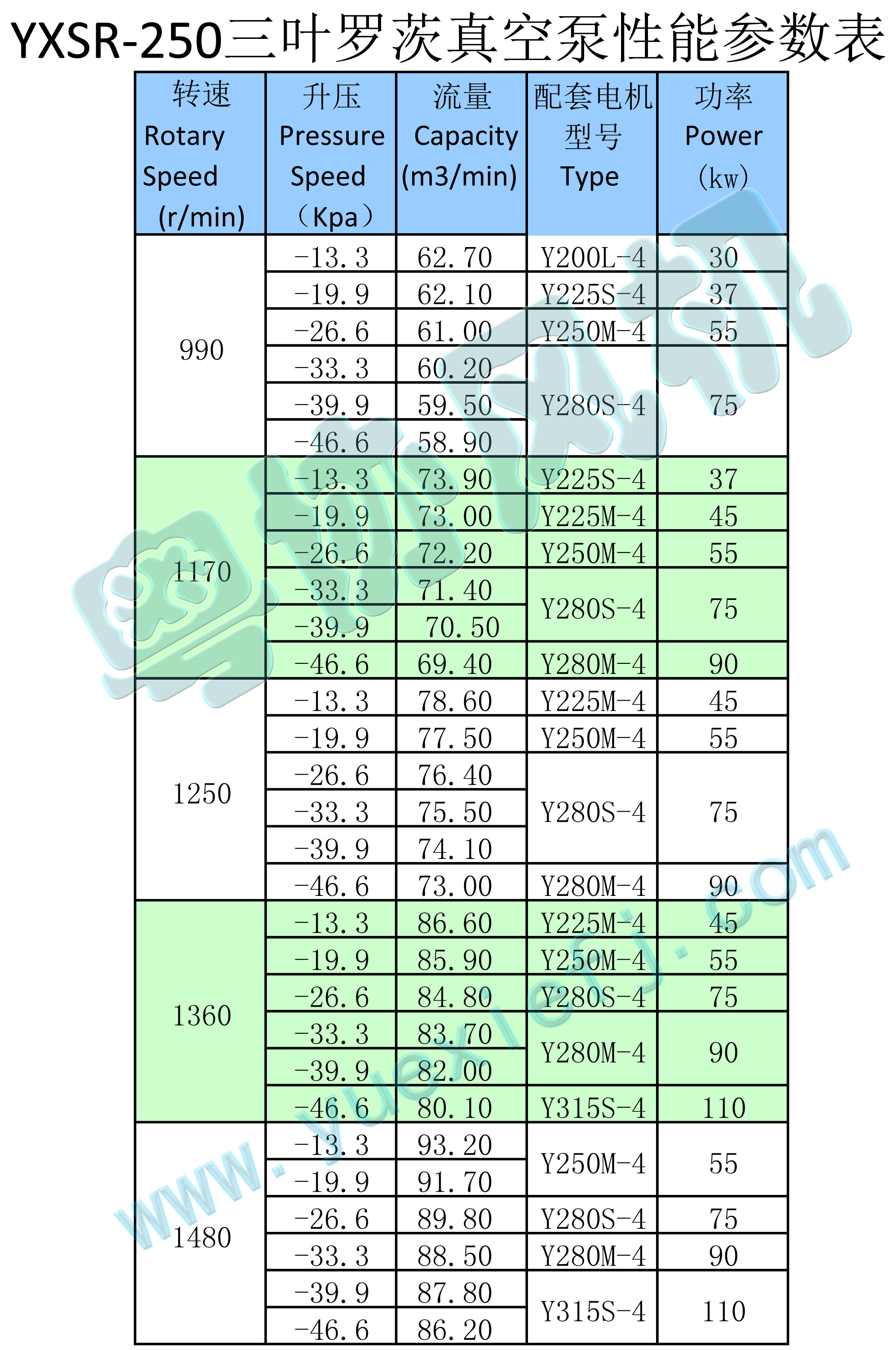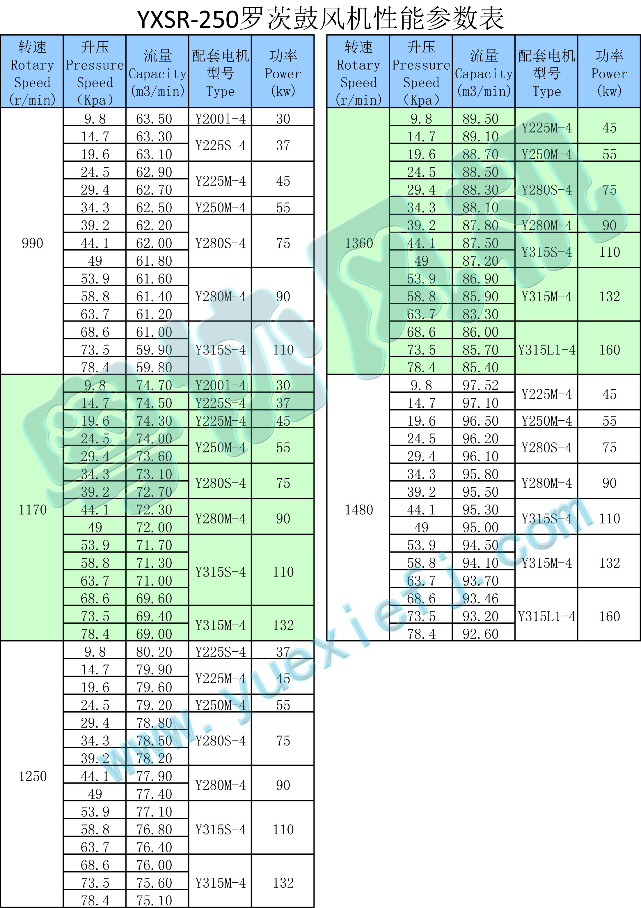 - 產(chǎn)品簡介:羅茨風機有鼓氣和吸氣兩款,YXSR-250系列的三葉羅茨鼓風機的流量范圍在59.8~97.52m3/min之間。
